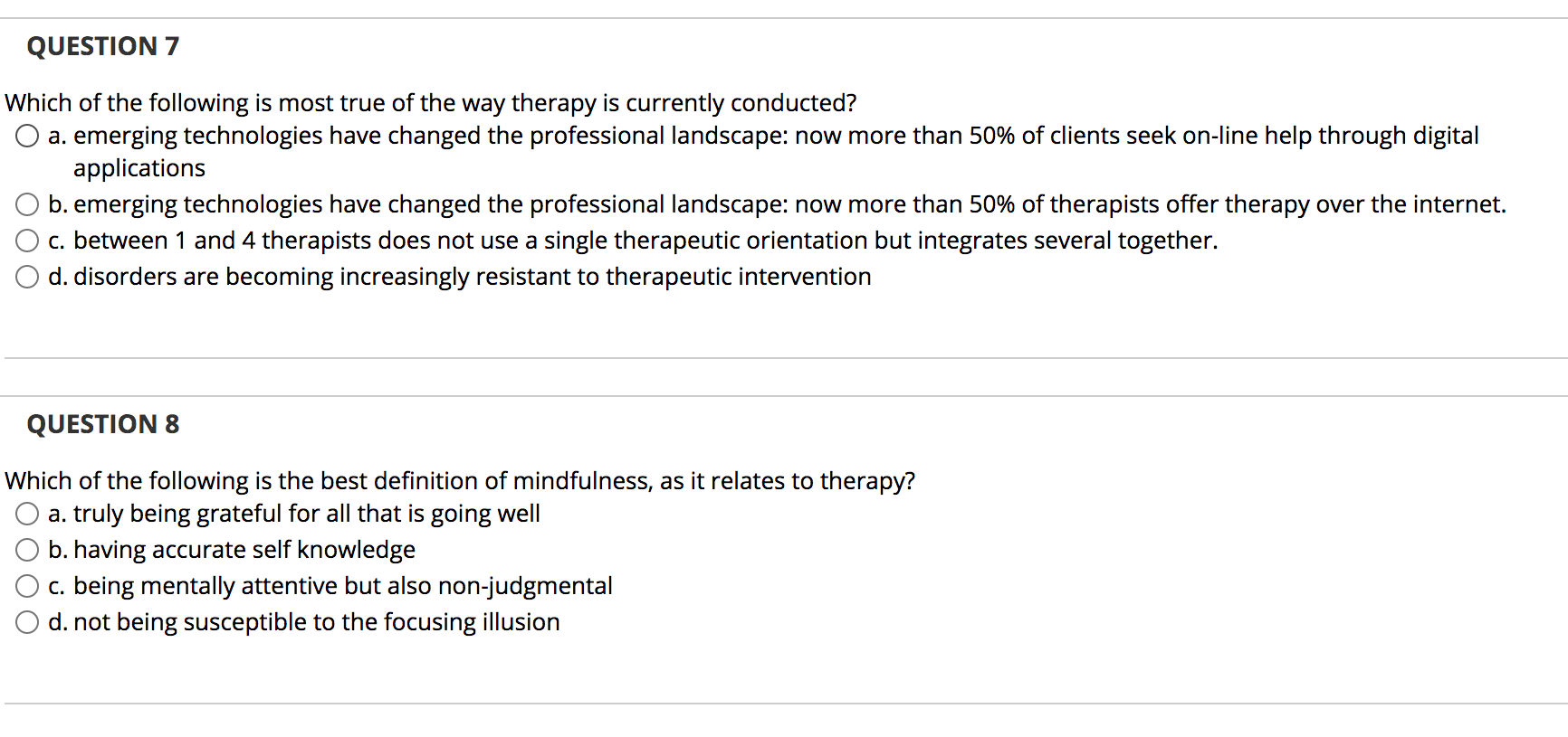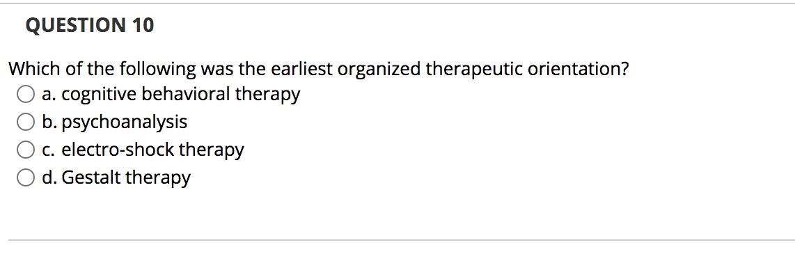 An approach that has gained widespread application in the treatment of substance abuse is cognitive-behavioral therapy CBT. Not being susceptible to the focusing illusion QUESTION 10 Which of the following was the earliest organized therapeutic orientation.